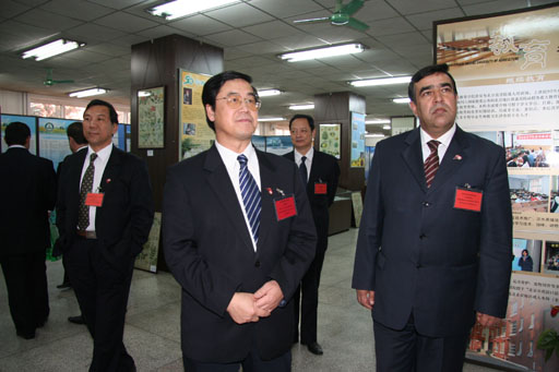 会后,塔吉克斯坦共和国教育部部长拉赫莫诺夫•阿布杜扎波尔(Rahmonov Abdujabbor)及随行人员与院长王有年、副院长杜晓林一同参观了校史展和友谊林。
