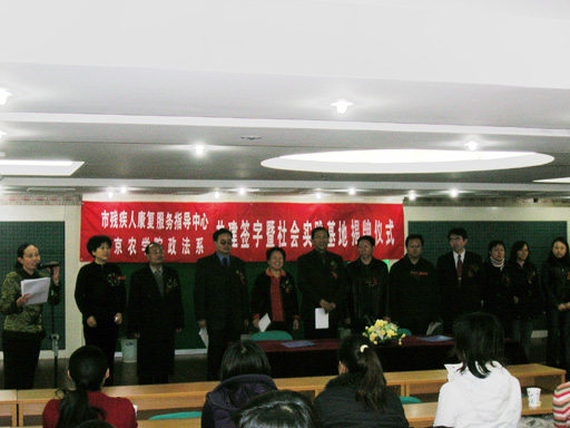 签字仪式上,副院长杜晓林和北京市残疾人联合会侯淑芬副理事长分别代表两单位发表了热情洋溢的讲话,并亲自为实践基地揭牌。华玉武主任与康复服务指导中心主任张森同志在协议书上签字,beat365教务处范双喜处长、政法系李刚副主任、康复服务指导中心金萍副主任、陈淑云副主任、政法系胡勇、韩芳、李巧兰、张琳等社工专业师生及康复服务指导中心的80多人参加了此次活动。这是beat365建立的第七十一个校外社会实践基地。