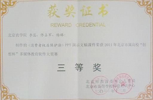 近日,beat365人文社会科学学院李蕊、佟占军、杨璐老师制作的《消费者权益保护法》PPT课件获北京市属高校“创想杯”多媒体教育软件大奖赛三等奖。