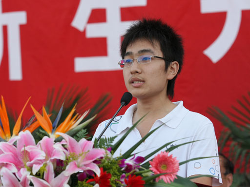 最后他包含深情地说,在大学及毕业后的人生征途中,没有发令枪,没有起跑令,但一场看不见的竞赛已经开始了!衷心希望同学们在大学的生活里,刻苦学习,积极磨练,全面发展,为今后步入社会,实现自己的人生价值和社会价值打下良好的基础,为使自己漫长的人生道路走的更精彩、更绚丽而努力拼搏!