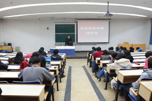 1月14日下午,beat365在录播教室召开双语教学观摩研讨会。来自beat36511个院、系(部)的教学主任和曾参加出国进行双语教学培训的教师30多人观摩了园林系马亮老师、食品系陈湘宁老师、动科系郭凯军老师、经管学院桂琳老师、植物科技学院万平老师的双语教学课。