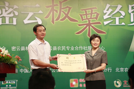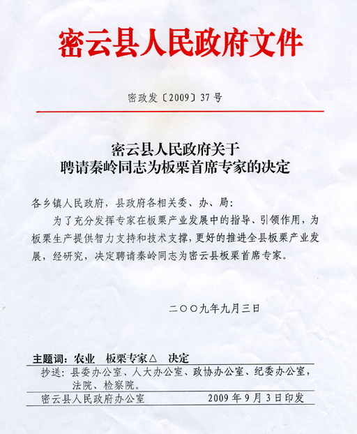 为了充分发挥专家在板栗产业发展中的指导、引导作用,更好地推动密云板栗产业的发展,密云县人民政府2009年第37号文件决定聘请秦岭教授为密云县板栗首席专家。在此次洽谈会上,密云县县委书记汪先永为秦岭教授颁发了聘书。