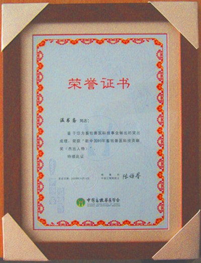 近日,鉴于温书斋教授为畜牧兽医科技事业做出的突出成绩,中国畜牧兽医学会特授予温教授“新中国60年畜牧兽医科技贡献奖(杰出人物)”称号。