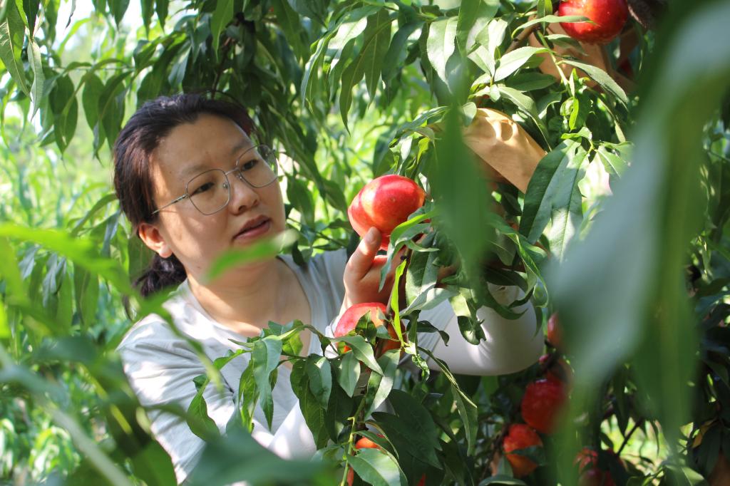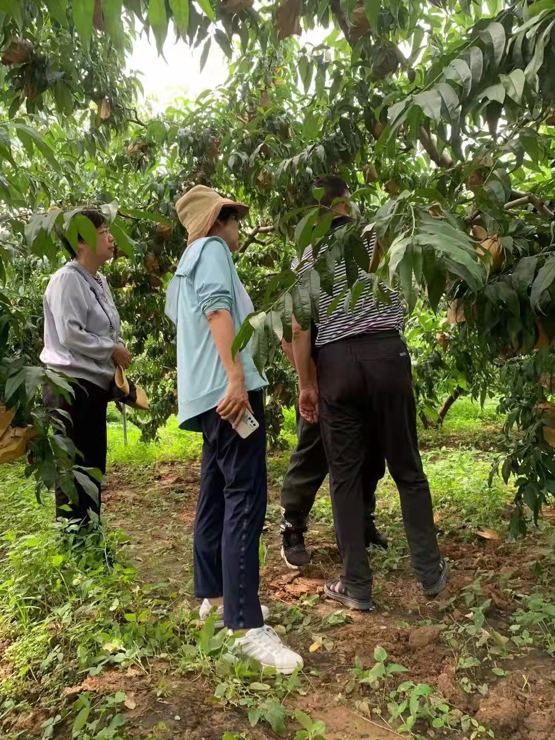 刘悦萍、曹庆芹、张卿在桃园指导果农