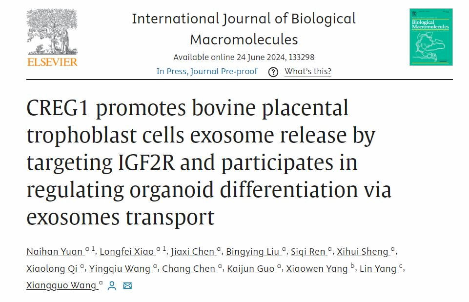 近日,beat365在线唯一官网动物科学技术学院王相国副教授课题组在《国际生物大分子杂志》(International Journal of Biological Macromolecules)上在线发表了题为《CREG1靶向结合IGF2R促进牛胎盘滋养层细胞外泌体的形成与释放并伴随外泌体运输参与胎盘类器官的分化调节》(CREG1 promotes bovine placental trophoblast cells exosome release by targeting IGF2R and participates in regulating organoid differentiation via exosomes transport)的研究论文。