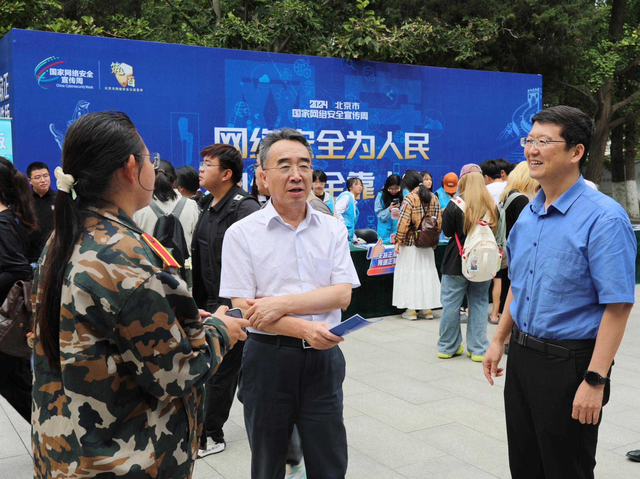 校党委书记赵锋到现场指导工作,慰问活动工作人员和学生志愿者,并就网络安全问题与师生深入交流。赵锋强调,要深入贯彻总体国家安全观,牢记维护网络安全永远在路上,相关部门要高度重视网络安全工作,各部门协同保障校园网络筑得牢、管得住、用得好;全校师生要切实增强全民国家安全意识,不断提升网络安全防范水平,全力营造绿色共享安全的校园网络环境。