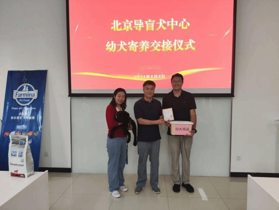 交接仪式上,张劲柏将两只幼犬分别交到两个寄养家庭代表手中,并送上幼犬生活用品。学校相关职能部门负责人介绍了北京导盲犬中心、寄养幼犬的基本情况以及寄养照护方案。动物科学技术学院2011届校友、法米娜宠物食品(上海)有限公司科学事务沟通经理叶茜代表爱心企业为寄养幼犬捐赠犬粮。
