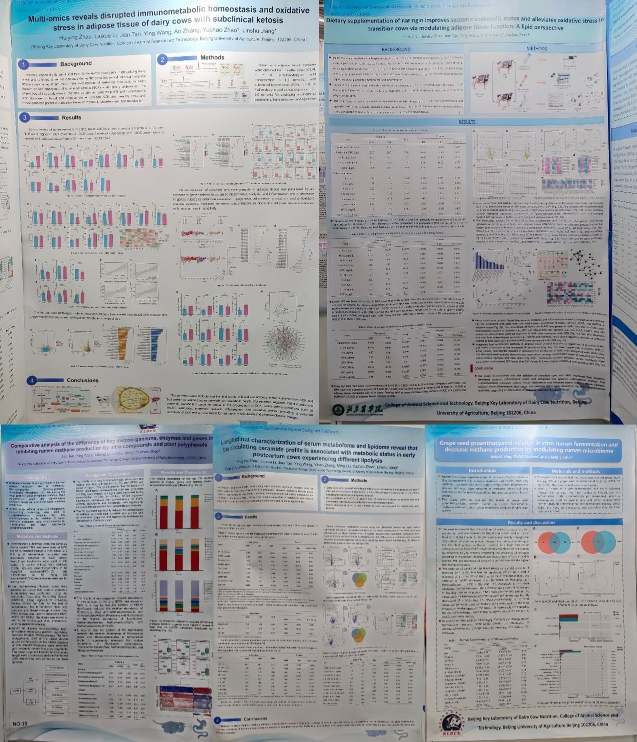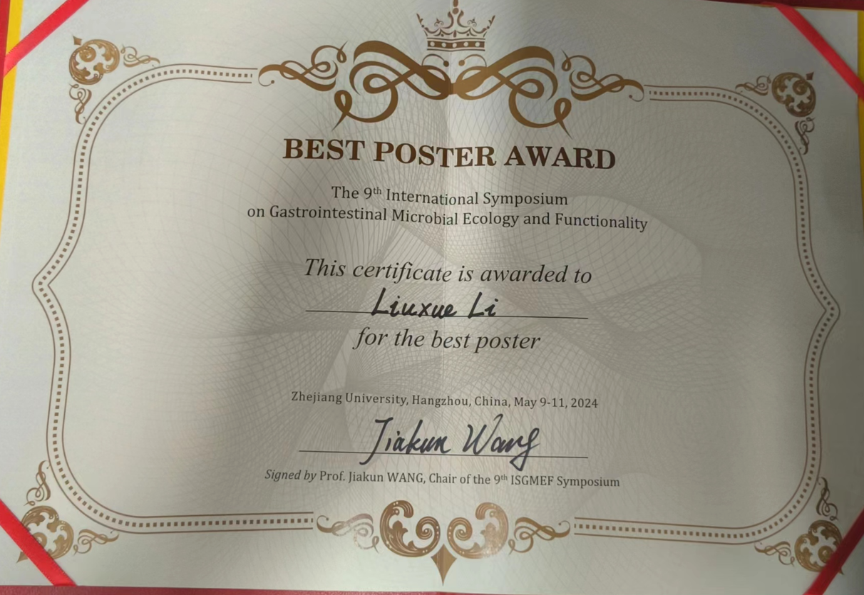 我院研究生赵慧颖、张奥、牛浩羽、李留学、谭健、王莹6名研究生投稿会议摘要9篇。两位正在北京大兴金银岛牧场开展奶牛饲喂试验的“00后”—牛浩羽和张奥的论文摘要被遴选为口头汇报,首次登上国际学术会议舞台,分别作了题为“Bioconversion of citrus waste by long-term DMSO-cryopreserved rumen fluid to volatile fatty acids and biogas is feasible: A microbiome perspective”和“Feeding citrus flavonoid extracts improves immunometabolic status by modulating hindgut microbiome and metabolome in lactating dairy cows”的学术报告。其余7篇论文摘要入选壁报展示,经国际专家组评选,研究生李留学的壁报“Dietary supplementation of naringin improves systemic metabolic status and alleviates oxidative stress in transition cows via modulating adipose tissue function: A lipid perspective”获得最佳壁报奖。研究生口头汇报和壁报全面展示了蒋林树教授团队在柑橘黄酮调控奶牛胃肠道功能上的最新研究进展。赵玉超副教授受组委会邀请主持了部分研究生口头汇报。
