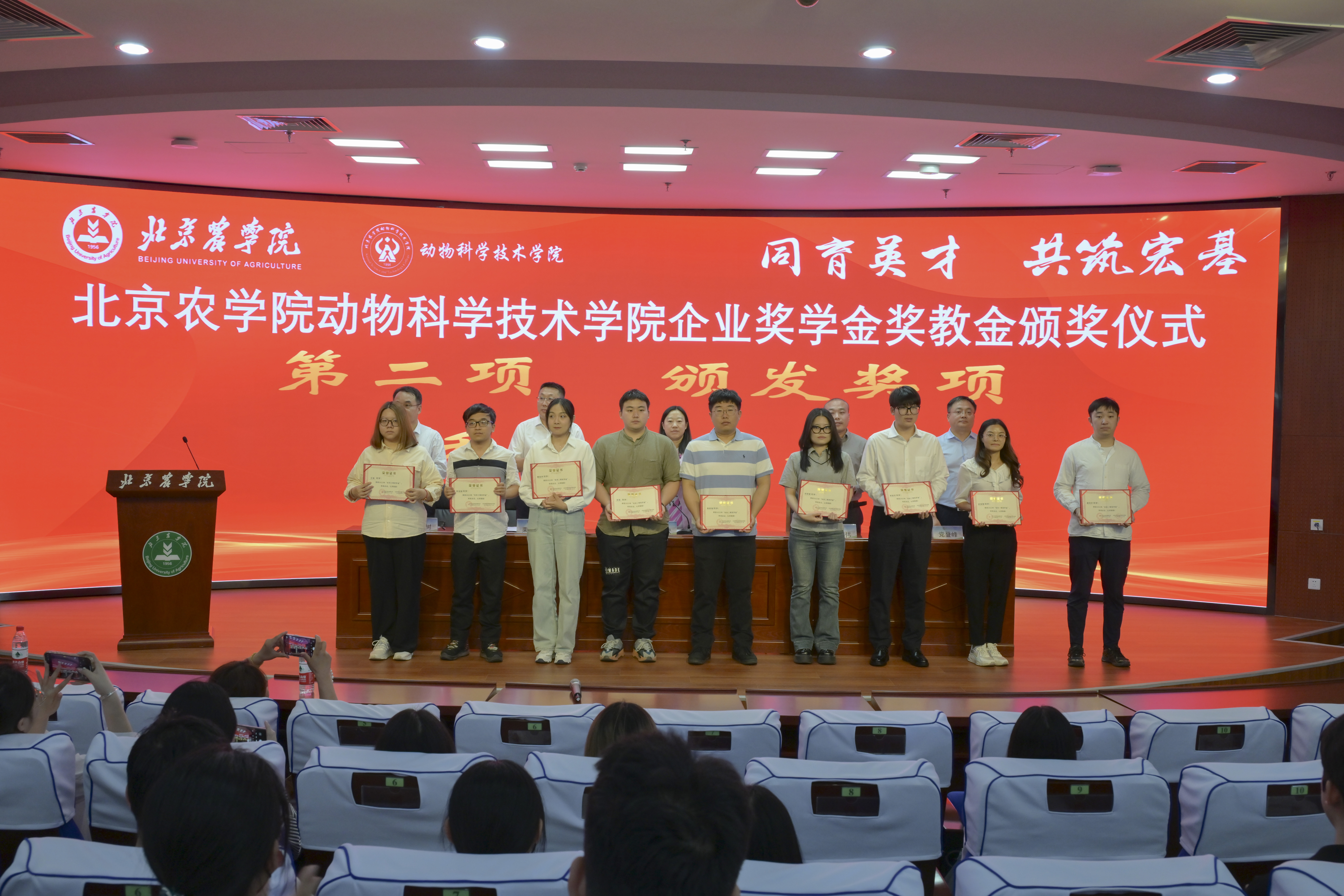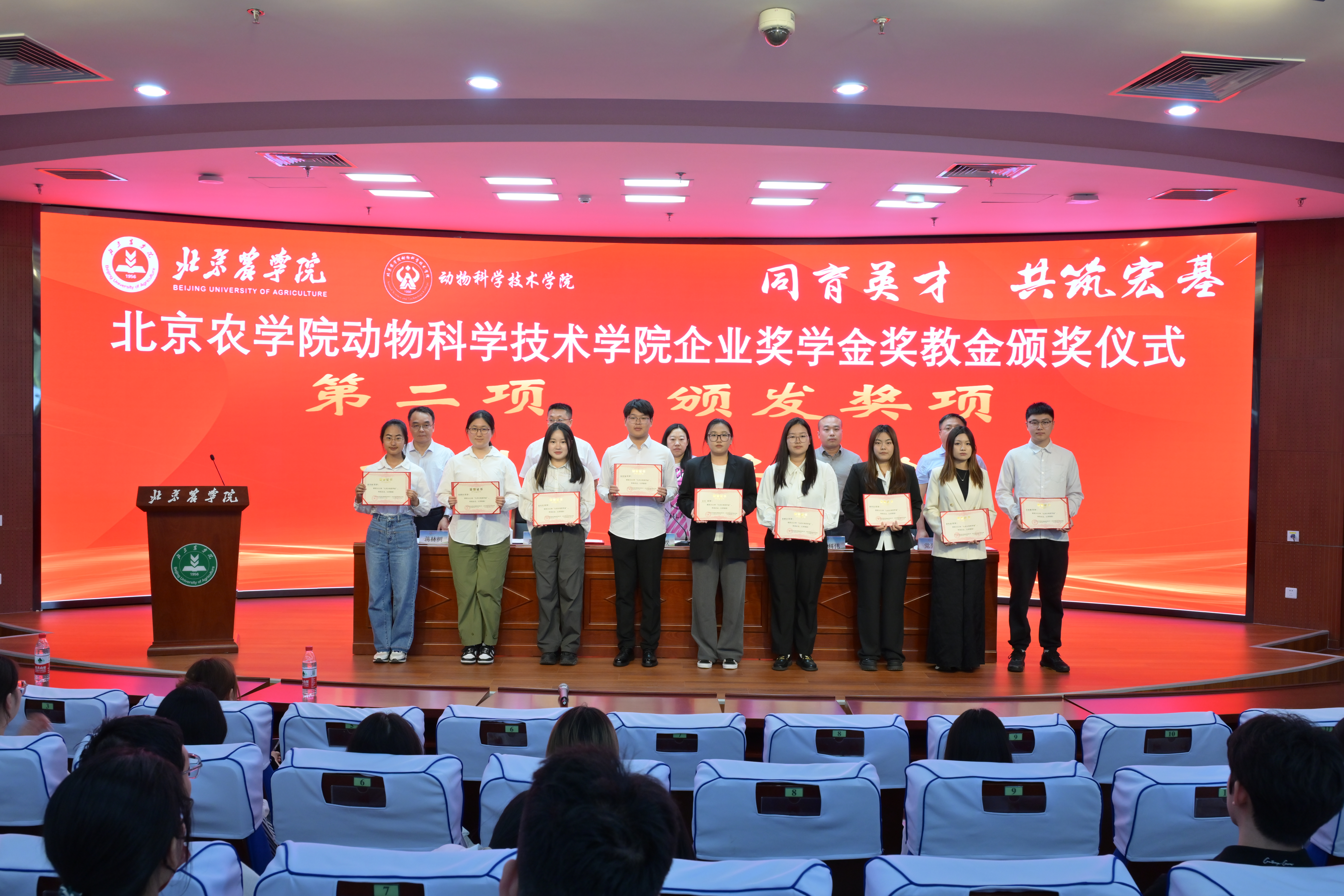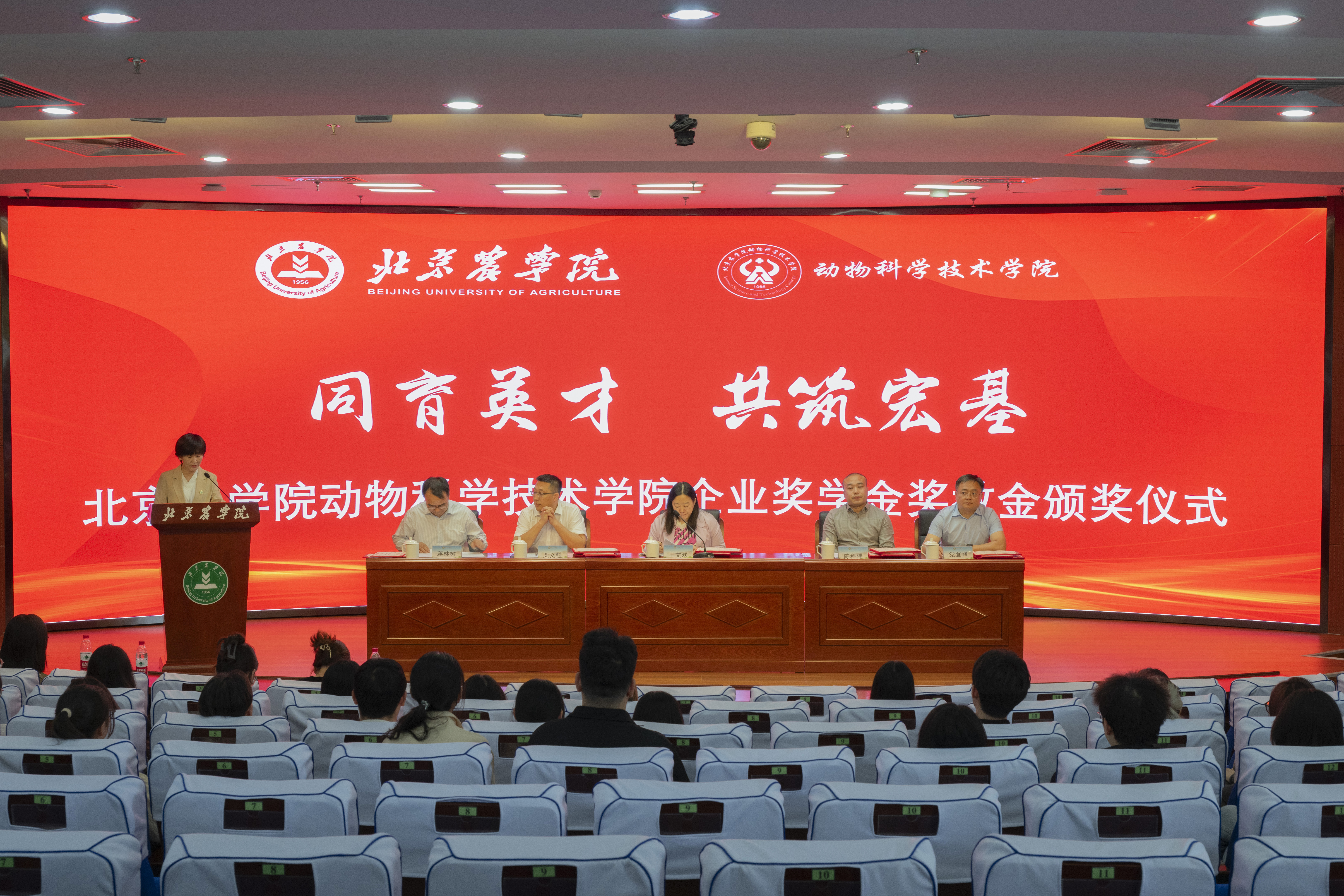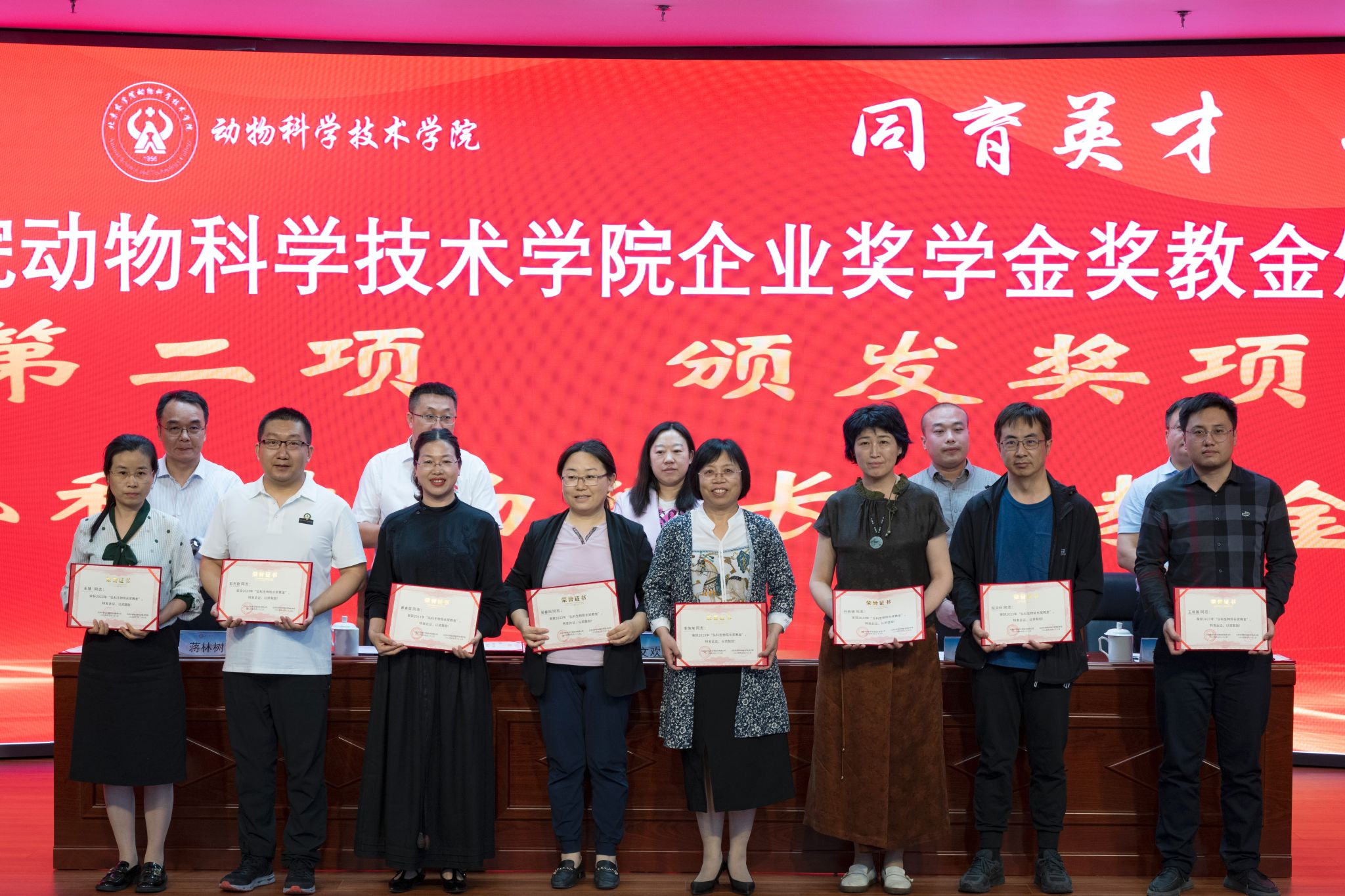 为进一步表彰先进,树立典型,以奖促教,以奖促学,扎实开展学风建设,不断提升人才培养水平,5月15日下午,动物科学技术学院在图书馆报告厅隆重举办2023年度弘科生物院长奖教金、九州大地奖学金和禾丰奖学金颁奖仪式。北京中农弘科生物技术有限公司人事总监王文欢、副总经理董彦君,天津九州大地饲料有限公司总经理陈科伟、技术骨干王民安,禾丰集团反刍事业线高级营养师、关内区反刍产品线技术研发总监、关内区反刍事业线总监栗文钰,学院党委书记党登峰,党委副书记、院长蒋林树,以及全体获奖师生参加了颁奖仪式。会议由学院党委副书记、副院长李向楠主持。