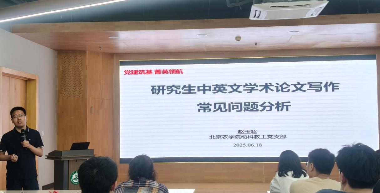 为深化党建引领育人实效,切实提升研究生学术写作能力,近日,动物科学技术学院教工党支部举办了第一期“党建筑基 菁英领航”专题活动。活动聚焦研究生学术发展需求,邀请了赵玉超副教授作题为“研究生中英文学术论文写作常见问题分析”的专题报告。