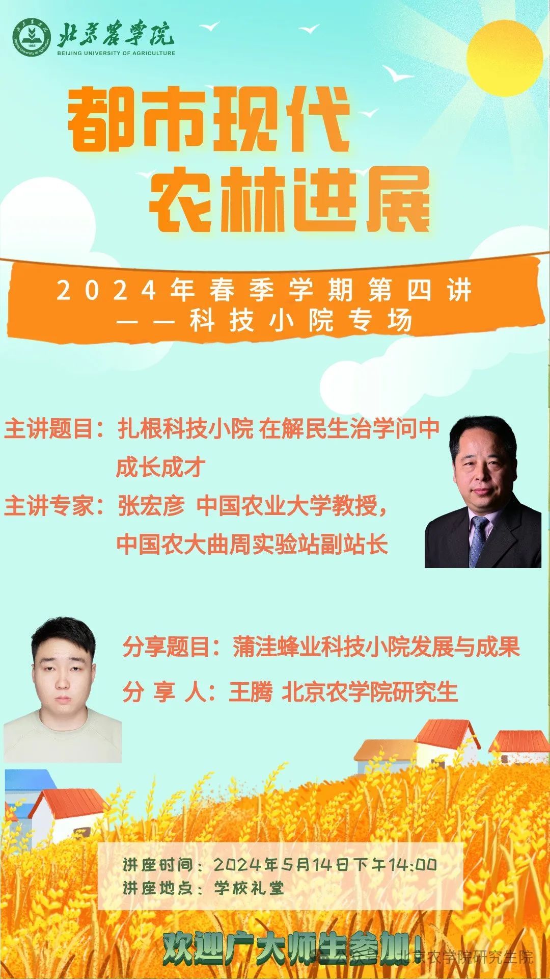 2023 年 5 月,习近平总书记给中国农业大学科技小院学生回信,对科技小院研究生“深入田间地头和村屯农家,在服务乡村振兴中解民生、治学问”予以充分肯定。为进一步深入学习贯彻回信精神,推进科技小院高质量发展,研究生院将于 2024年 5 月14日下午14:00进行“都市现代农林进展”讲座“科技小院”专场,诚邀广大师生现场聆听。
