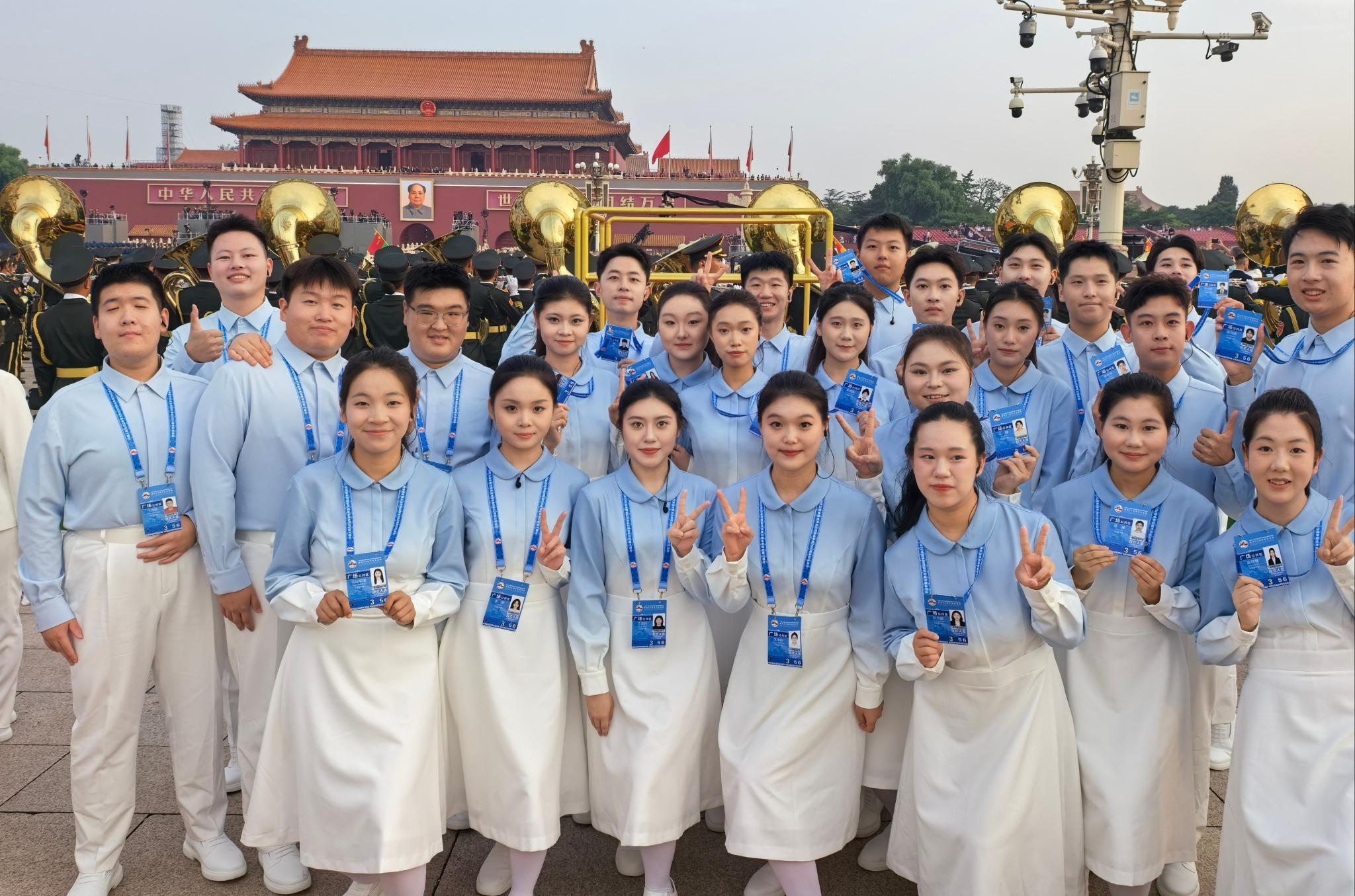 9月3日清晨,所有付出在这一刻汇聚成最美的和声。站在天安门广场合唱团中,她们以最真挚的情感、最嘹亮的歌声,唱出对祖国的热爱、对历史的敬畏、对和平的珍视。从守护国旗到为祖国放歌,她们在不同舞台上闪耀光芒,用实际行动践行“请党放心,强国有我”的青春誓言。