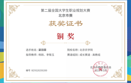 智启新程,赛场砺锋。在本科生科研训练项目方面取得进展,近期有3项项目成功立项。这些项目涵盖了经管领域的多个热点和前沿问题,学生们在项目中积极探索、勇于创新,展现出对学术研究的浓厚兴趣和扎实的研究能力。在第二届全国大学生职业规划大赛的舞台上,2023级农经1班梁羽菲同学以“心怀家国志,规划致未来”为航标,将专业知识与职业理想深度融合,以清晰的自我认知、科学的路径规划、务实的实践成果脱颖而出,荣获北京市高教组铜奖。