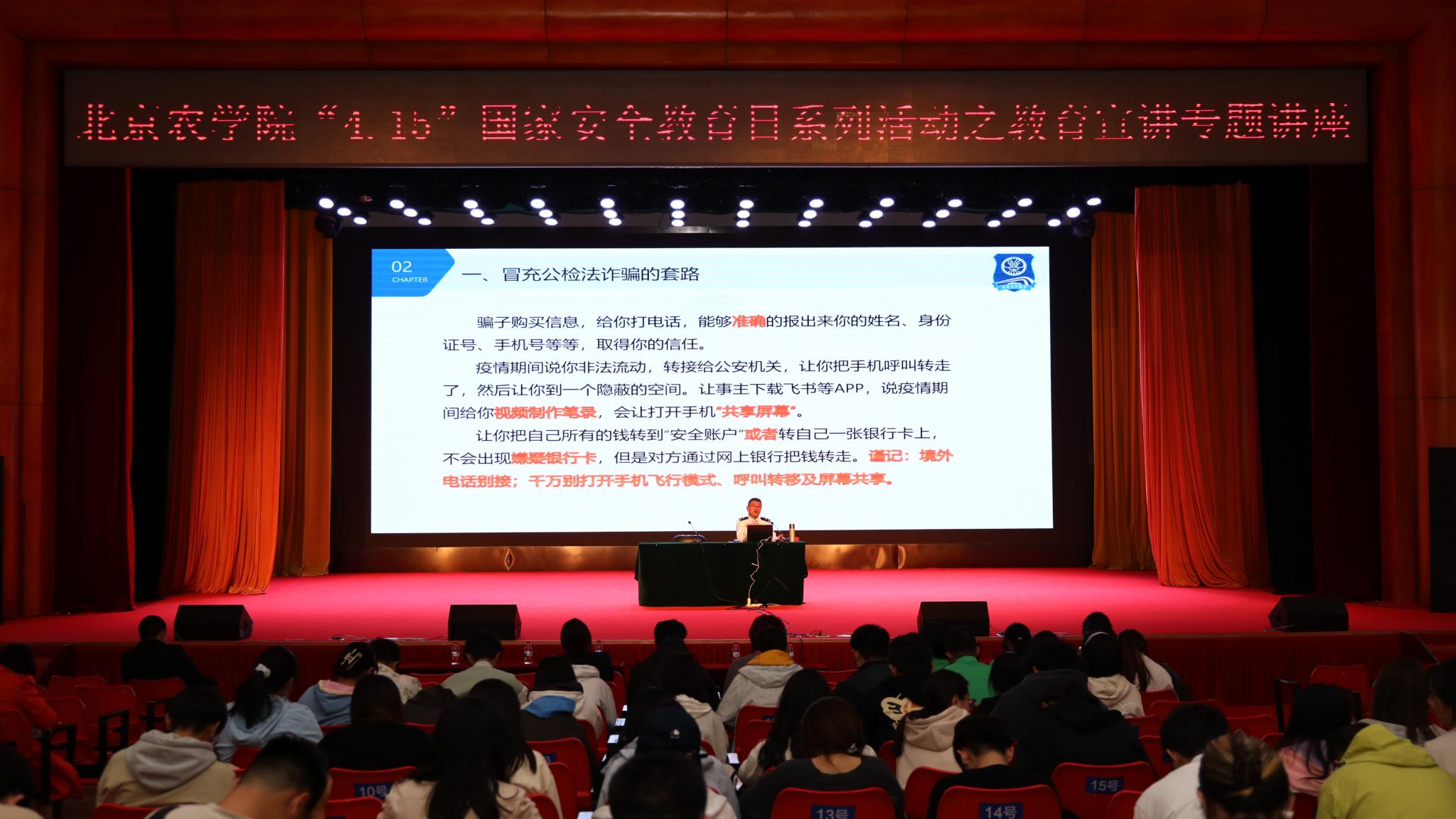 活动压轴环节,北京市公安局公交总队特警大队大队长鲍峰向广大师生作专题报告。通过防间反诈案例、关键技术“卡脖子"困境等鲜活素材,系统剖析国家安全领域的风险点。报告特别聚焦青年群体,提醒大学生在学术交流、网络社交、求职就业、AI应用中增强保密意识,强调“国家安全并非遥不可及,每个人都是防线的一环”。