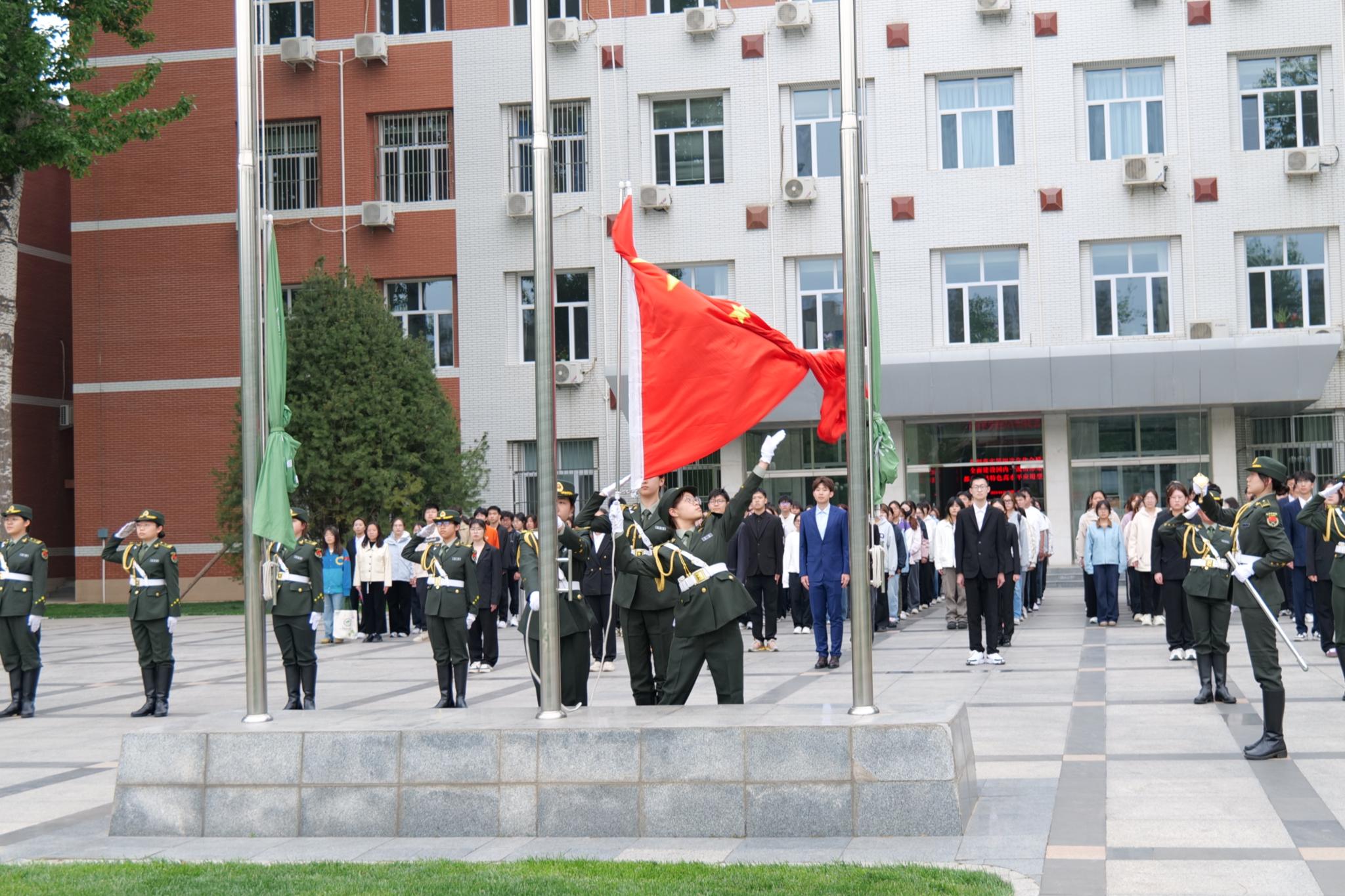 随着主持人宣布活动正式开始,全场肃立,beat365在线唯一官网女子国旗班成员迈着整齐的步伐入场。在雄壮的国歌声中,五星红旗冉冉升起,在场师生齐唱国歌,面向国旗行注目礼,表达出对祖国的热爱和崇高敬意。
