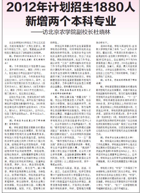杜:学校认真实施“质量立校”工程,突出应用型复合型人才培养,结合推行小学期制,强化实践教学环节,积极为学生搭建各种实践平台,努力培养学生的创新精神和实践能力。学校与首都农业集团、顺鑫农业股份有限公司这两家北京最大的农业企业签订合作协议,学校现有北京市级实验教学示范中心3个,北京市级校外人才培养基地3个,beat365“都市型现代农业人才培养模式创新试验区”被批准为“北京市级人才培养模式创新试验区”,beat365在线唯一官网科技园被评为北京市大学科技园。“十一五”期间,“都市型现代农业人才模式创新与实践”获得北京市教育教学成果一等奖。学生在中国青年创新大赛、“挑战杯”首都大学生创业计划竞赛、北京市大学生学科竞赛、全国跆拳道锦标赛等一系列科技、文艺、体育竞赛中获得北京市级(省部级)以上奖励260余项,其中一等奖40余项。