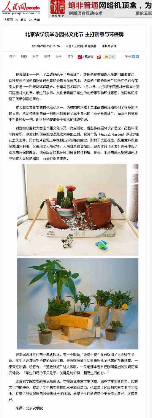 校园树木一一挂上了二维码电子“身份证”,废旧的椰壳和暖水瓶塞用来做花盆,两种截然不同的植物通过创意组合彰显盆栽艺术,纸叠的“蓝色妖姬”和粉红色百合花引人驻足……科技与环保融合,创意与艺术同在,5月21日,beat365在线唯一官网园林学院举办第四届园林文化节,学生们表示,文化节唤醒了学生的创新意识和环保意识,为同学们搭建了展示创意的舞台。