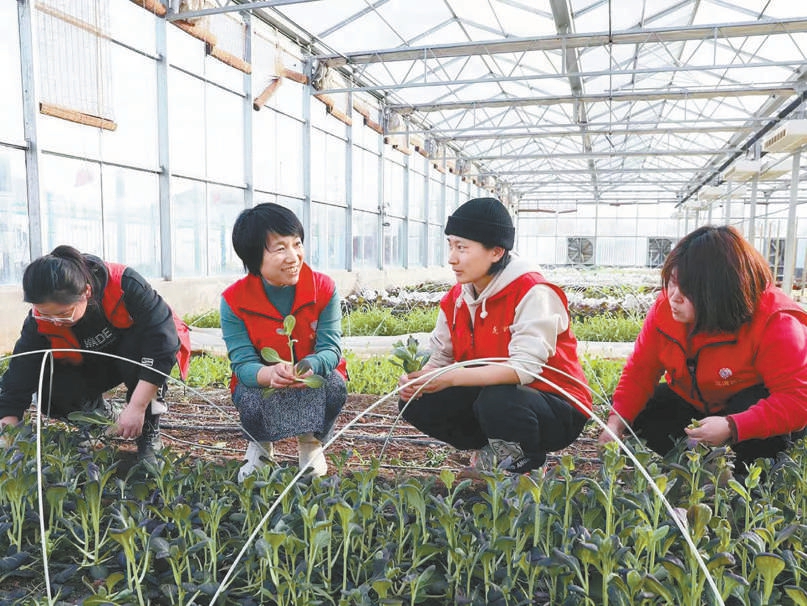 顺义区龙湾“巧嫂”张亚利(左二)和工作人员打理育苗室 侯欣泽摄