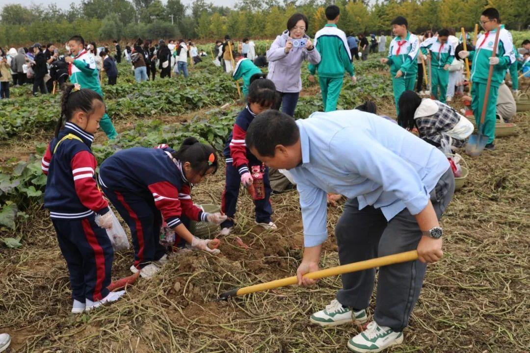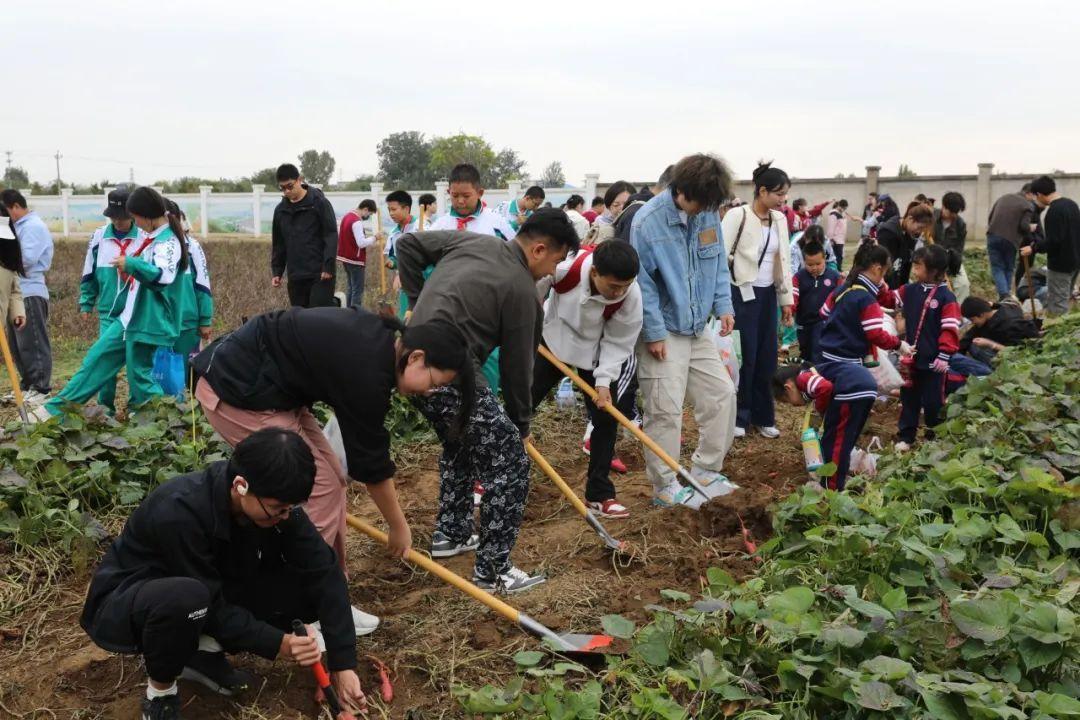 来自北京一零一中学昌平实验学校的中小学生在beat365在线唯一官网学生的指导下体验秋收农事活动。小学一年级的陈浥尘举着自己挖到的一大兜花生高兴地说:“以前在姥姥家挖过土豆,跟今天的体验完全不一样,太有意思啦!”初中一年级的陈宇桐说:“没想到采收红薯和花生还有这么多的学问,我们不仅学习到了课本以外的知识,还体验到了劳动的快乐,理解了劳动的价值与意义,今后将更加珍惜粮食,热爱劳动。”