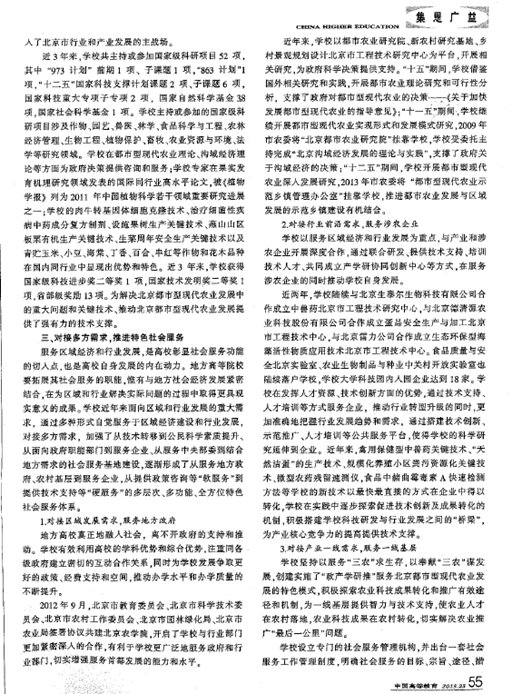 学校利用自身人才优势和技术创新优势,以首都农产品安全产业技术研究院、农业应用与新技术北京市重点实验室、兽医学(中医药)北京市重点实验室、都市农业(北方)农业部重点实验室、农产品安全检测与控制重点实验室、农业部现代农业技术培训基地、综合试验站为平台,切实发挥为行业基层服务的功能,以学校各学科、各重点实验室研发的技术、品种、产品等为动物生产、植物生产、循环农业、农产品安全和生态环境建设等产业的发展服务。三年来共推广和转化农业技术和成果280项,帮助京郊100多个村镇完成了经济社会发展规划编制,培训农村实用人才50000余人次。 农业部现代农业技术培训基地仅2013年上半年就承接农业部和市农业系统培训12期,共培训1000余人。