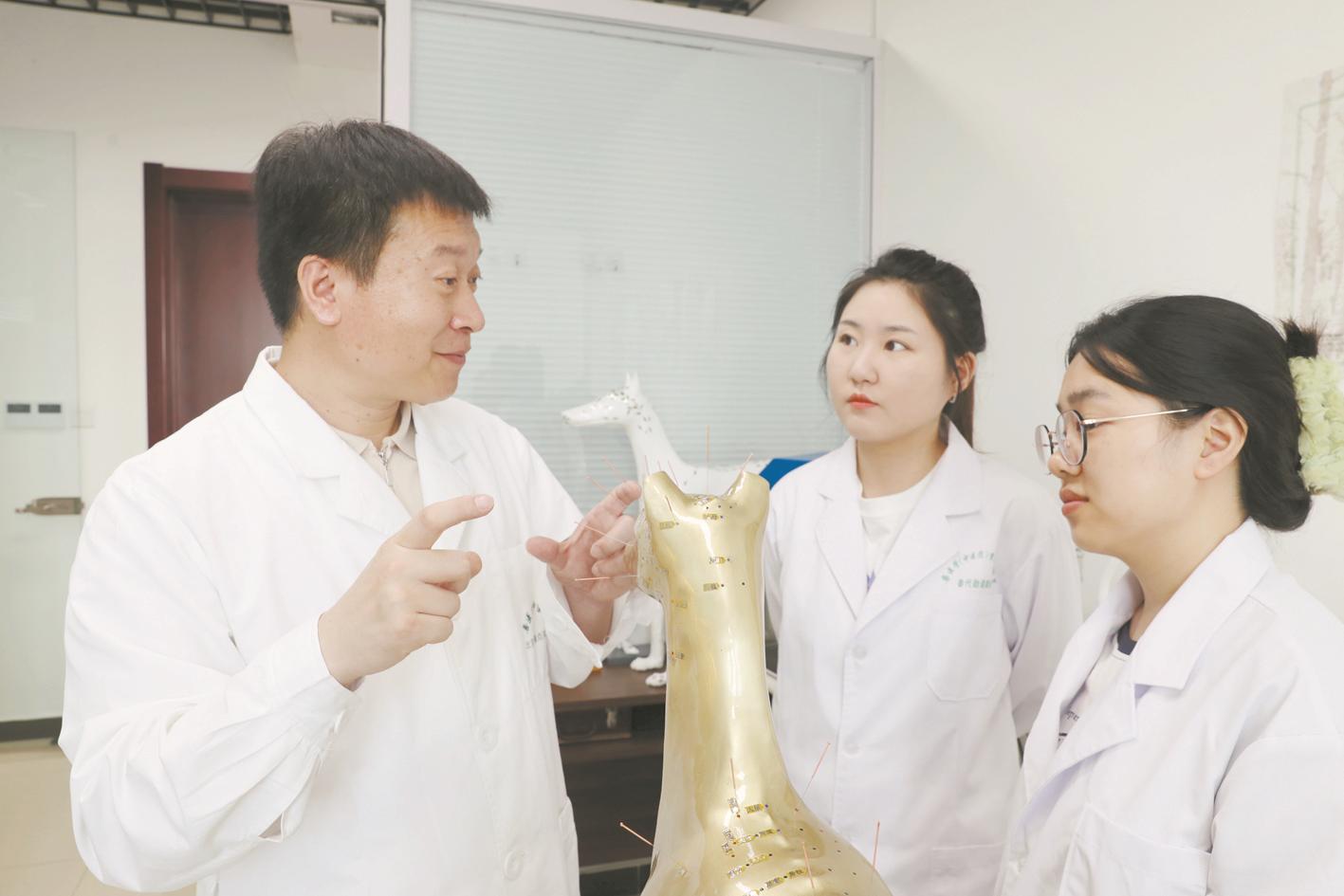 姜代勋长期在兽医学(中医药)北京市重点实验室开展科研工作,深入研究传统兽医理论与现代分子生物学技术的交叉应用等领域,承担了国家自然科学基金项目、北京市自然科学基金项目等多项科研课题。他还定期在动物医院坐诊,为患病宠物提供中兽医诊疗服务,针灸就是他常用的治疗手段,疗效得到宠物主人的认可。“针灸主要用于西兽医治不了或者疗效不好的一些宠物病症,包括关节疼痛、跛行、神经性疾病、心脏病等,只要是功能性的问题都可以用针灸调理。”姜代勋介绍说。