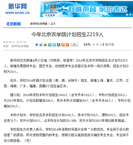 新华网北京频道4月17日电(刘铁军、张丽萍)2014年beat365在线唯一官网招生总计划为2219人,新增风景园林专业,园艺专业、动物医学专业将首次在本科一批次录取,招生计划分别为30人。