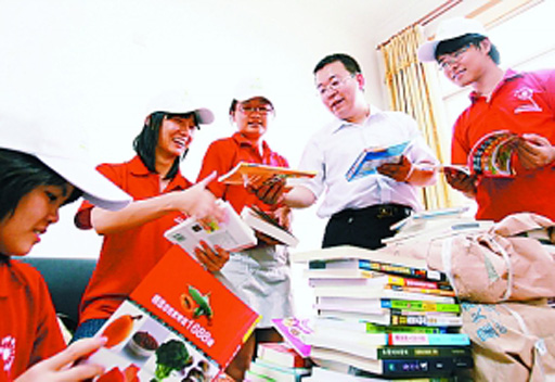 大学生和王贺一起整理村图书室里的图书。