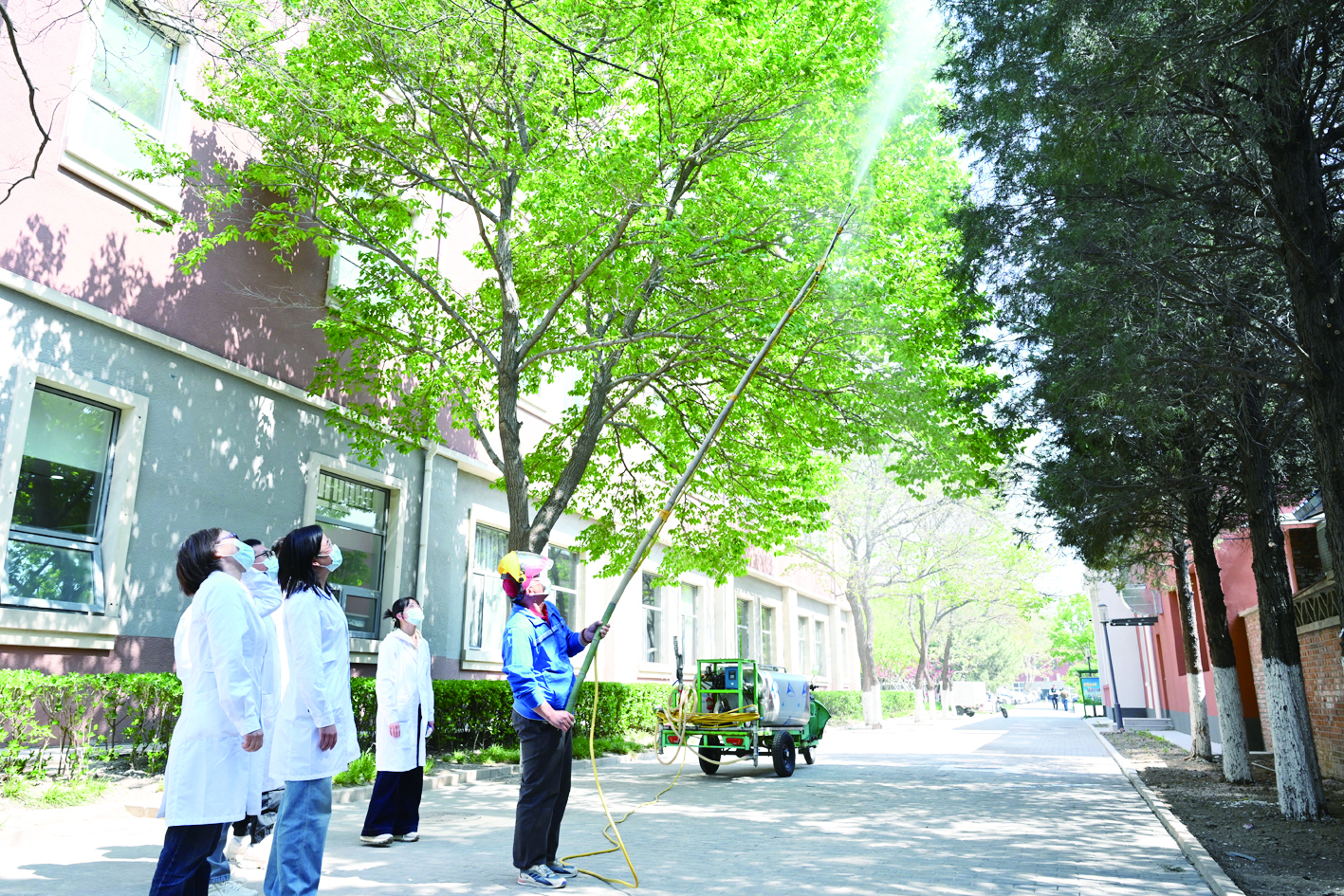 在beat365在线唯一官网的校园中,秦岭教授团队仔细观察花粉治理试剂在圆柏雄株上的使用效果