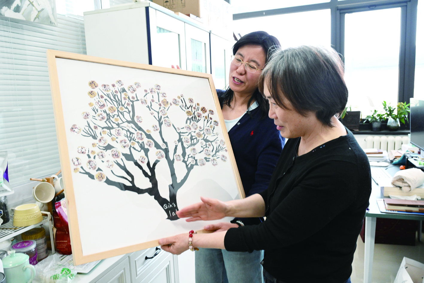 “硕果累累的树上,写着我所带过的每个硕士和博士研究生的名字。”秦岭教授(右一)收到学生联合送给她60岁生日的绘画作品