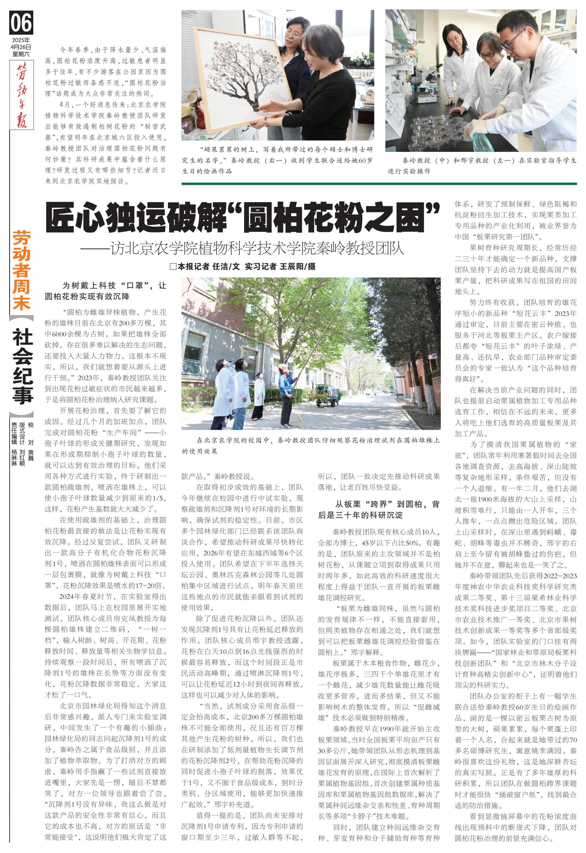 “圆柏为雌雄异株植物,产生花粉的雄株目前在北京有200多万棵,其中6000余棵为古树。如果把雄株全部砍掉,存在很多难以解决的生态问题,还要投入大量人力物力,这根本不现实,所以,我们就想着要从源头上进行干预。”2023年,秦岭教授团队关注到出现花粉过敏症状的市民越来越多,于是将圆柏花粉治理纳入研究课题。