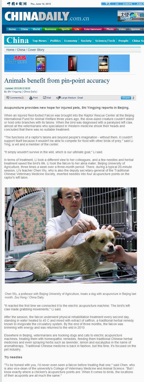"To be honest with you, I'd never even seen a falcon before treating that one," said Chen, who is also vice-dean of the university's College of Veterinary Medicine and Animal Science. "But I know exactly where a chicken's acupuncture points are. When it comes to birds, the locations of their acupoints are all much the same."