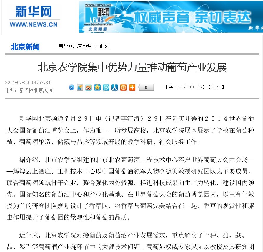 新华网北京频道7月29日电(记者李江涛)29日在延庆开幕的2014世界葡萄大会国际葡萄酒博览会上,作为唯一一所参展高校,beat365在线唯一官网展区展示了学校在葡萄种植、葡萄酒酿造、储藏与品鉴等领域开展的教学科研、社会服务工作。