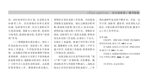 (三)综合协调要有新手段。高校办公室起着沟通上下,联系左右,协调内外的纽带作用,担负着十分繁重的协调任务,必须在综合协调上不断创新工作方法,学会“十个手指头弹钢琴”。在协调和处理政务、事务时,要采取平等的形式,磋商的语调进行协调。对师生员工和家长来信来访和反映的实际困难问题,该解决的要及时向领导反映并积极配合解决,并举一反三,形成长效机制。要科学合理地安排领导公务活动,要坚持从严掌握、统筹兼顾、计划安排、突出重点、注重实效的原则,提出每天、每周、每月的工作活动安排及建议,要在一些原则问题上严格把关,确保领导同志从文山会海和应酬性活动中解脱出来,有足够的精力谋大事、抓大事、干实事。办公室决不可以满足于现状,只有各类工作中不断创新,才能在不断把工作推向前进,才能建立一支综合素质与工作任务相适应,工作能力与领导要求相适应的队伍,才能出色地完成领导交办的各项任务。