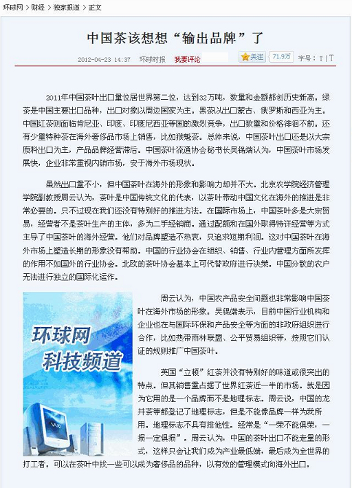 周云认为,中国农产品安全问题也非常影响中国茶叶在海外市场的形象。吴锡端表示,目前中国行业机构和企业也在与国际环保和产品安全等方面的非政府组织进行合作,比如热带雨林联盟、公平贸易组织等,按照它们认证的规则推广中国茶叶。