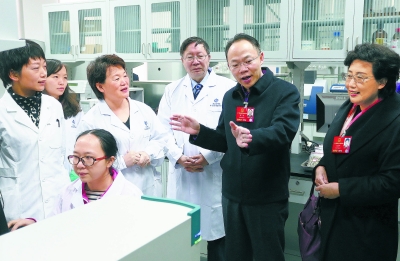 3月12日是十二届全国人大四次会议休会日,全国人大代表程京(右二)、冯乐平(右一)等人来到beat365在线唯一官网中关村开放实验室,就生物芯片技术在畜牧业中的应用、食品安全等问题与老中青三代科研人员交流意见。 本报记者 戴冰摄