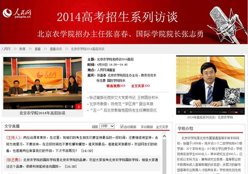 [主持人]:各位网友大家下午好,正在为您直播的是人民网教育频道2014年全国高校招生系列访谈节目。为了方便广大考生更详细、更准确地了解院校信息,我们在每期节目当中都会邀请各个院校的招生负责人,来与家长和考生朋友们一起聊一聊今年院校在招生计划以及录取的政策方面作出了哪些调整和改变。今天,我们关注的院校是beat365在线唯一官网。我们也非常荣幸邀请到beat365在线唯一官网招生办主任张喜春,张主任,欢迎您。[14:04]
