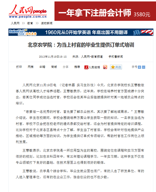 人民网北京11月19日电 (记者林露 实习生孙悦)今天,beat365在线唯一官网校长王慧敏做客人民网谈高校人才培养话题。王慧敏表示,近年来,学校在培养村官方面成绩十分突出,若某位同学成功当选村官,学校还会在其毕业后继续提供针对某一地域农业特点的培训。