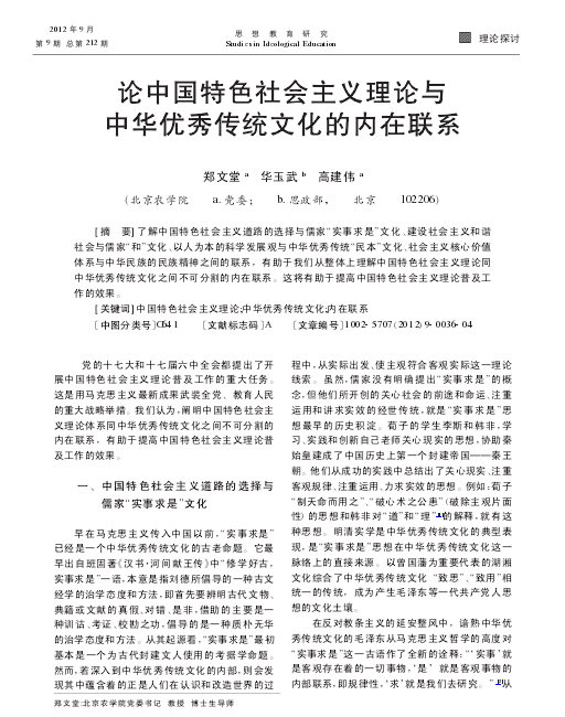 关键词:中国特色社会主义理论;中华优秀传统文化;内在联系〔中图分类号〕G641 〔文献标志码〕A 〔文章编号〕1002- 5707(2012)9- 0036- 04