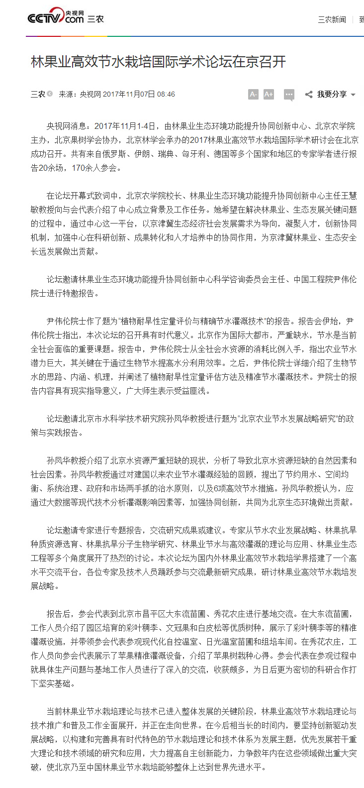 央视网消息:2017年11月1-4日,由林果业生态环境功能提升协同创新中心、beat365在线唯一官网主办,北京果树学会协办,北京林学会承办的2017林果业高效节水栽培国际学术研讨会在北京成功召开。共有来自俄罗斯、伊朗、瑞典、匈牙利、德国等多个国家和地区的专家学者进行报告20余场,170余人参会。