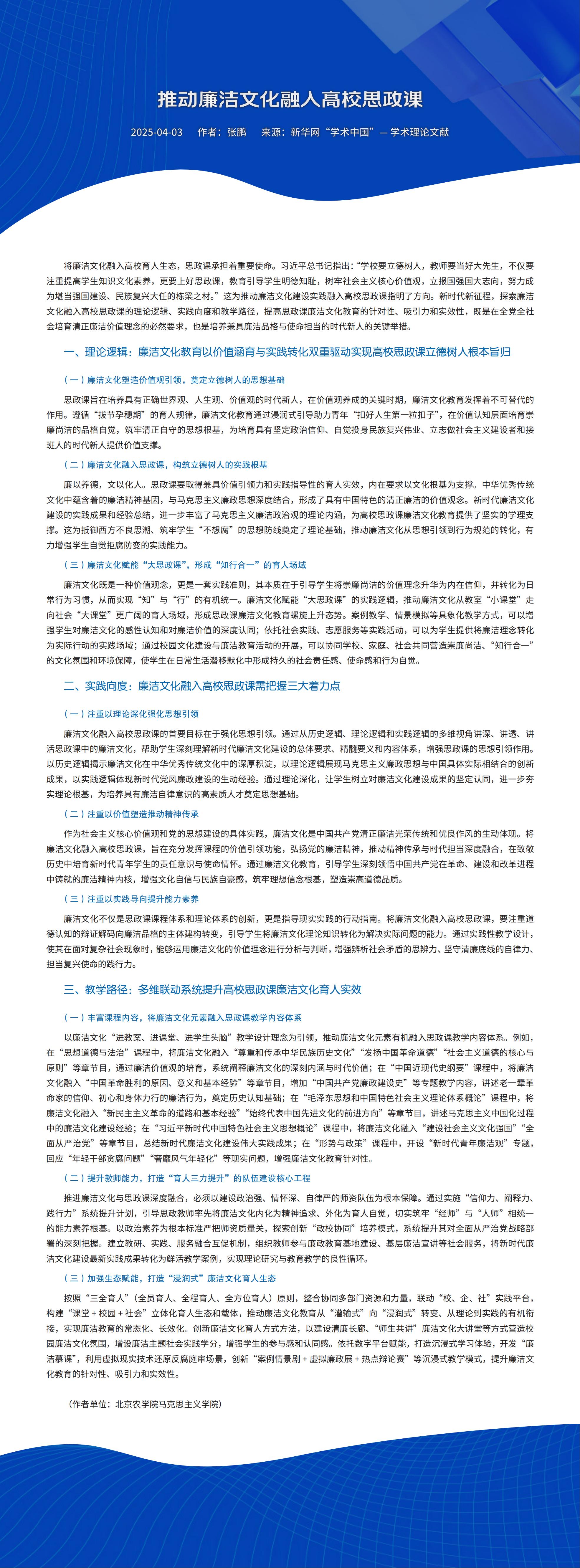 摘要:将廉洁文化融入高校育人生态,思政课承担着重要使命。本文从三个方面对推动廉洁文化融入高校思政课进行了详细论述,以期在全党全社会培育清正廉洁价值理念,培养兼具廉洁品格与使命担当的时代新人。