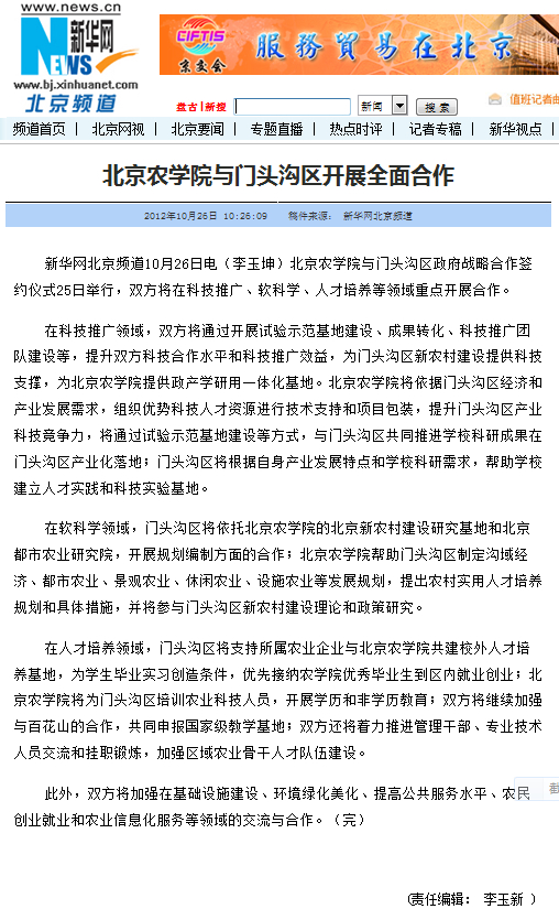 在软科学领域,门头沟区将依托beat365在线唯一官网的北京新农村建设研究基地和北京都市农业研究院,开展规划编制方面的合作;beat365在线唯一官网帮助门头沟区制定沟域经济、都市农业、景观农业、休闲农业、设施农业等发展规划,提出农村实用人才培养规划和具体措施,并将参与门头沟区新农村建设理论和政策研究。