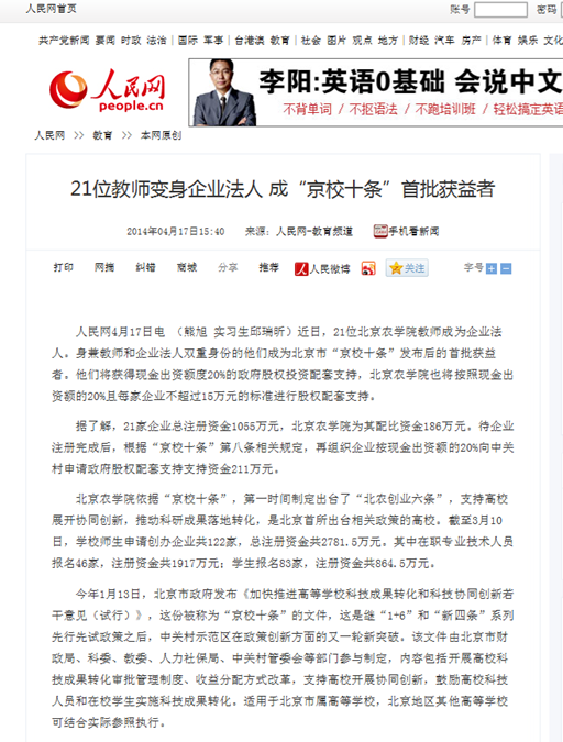 今年1月13日,北京市政府发布《加快推进高等学校科技成果转化和科技协同创新若干意见(试行)》,这份被称为“京校十条”的文件,这是继“1+6”和“新四条”系列先行先试政策之后,中关村示范区在政策创新方面的又一轮新突破。该文件由北京市财政局、科委、教委、人力社保局、中关村管委会等部门参与制定,内容包括开展高校科技成果转化审批管理制度、收益分配方式改革,支持高校开展协同创新,鼓励高校科技人员和在校学生实施科技成果转化。适用于北京市属高等学校,北京地区其他高等学校可结合实际参照执行。