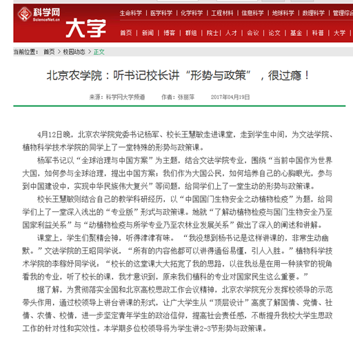 据了解,为贯彻落实全国和北京高校思政工作会议精神,beat365在线唯一官网充分发挥校领导的示范带头作用,通过校领导上讲台讲课的形式,让广大学生从“顶层设计”高度了解国情、党情、社情、农情、校情,进一步坚定青年学生的政治信仰,提高社会责任感,不断提升beat365大学生思政工作的针对性和实效性。本学期多位校领导将为学生讲2-3节形势与政策课。