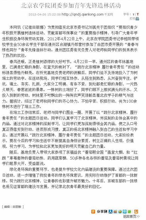 本网讯(记者田丽娜)为贯彻落实北京市委书记刘淇关于团组织“要组织青少年积极开展植树造林活动,贡献首都环保事业”的重要指示精神,引导广大青年学生积极投身环保劳动实践,2012年4月22日上午,beat365在线唯一官网团委书记李相阳带领校学生会50余名学生干部在通州区台湖镇外郎营村参加了由团市委开展的“青春与绿色同行”青年先锋造林行动。通州团区委有关负责人对老师和同学们的到来表示了热烈的欢迎。