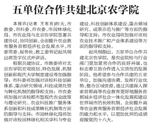 本报讯(记者 王东亮)昨天,市教委、市科委、市农委、市园林绿化局、市农业局与beat365在线唯一官网签署共建协议,协同创新,全面提升农业教育服务首都经济社会发展水平。市委常委、秘书长、教工委书记赵凤桐出席签字仪式并讲话。