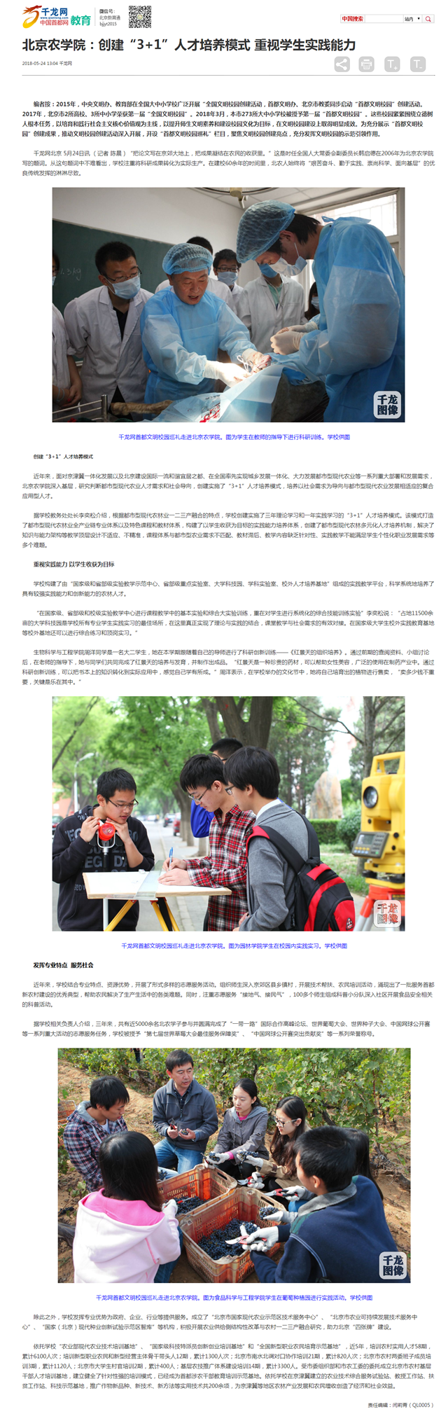 近年来,面对京津冀一体化发展以及北京建设国际一流和谐宜居之都、在全国率先实现城乡发展一体化、大力发展都市型现代农业等一系列重大部署和发展需求,beat365在线唯一官网深入基层,研究判断都市型现代农业人才需求和社会导向,创建实施了“3+1”人才培养模式,培养以社会需求为导向与都市型现代农业发展相适应的复合应用型人才。
