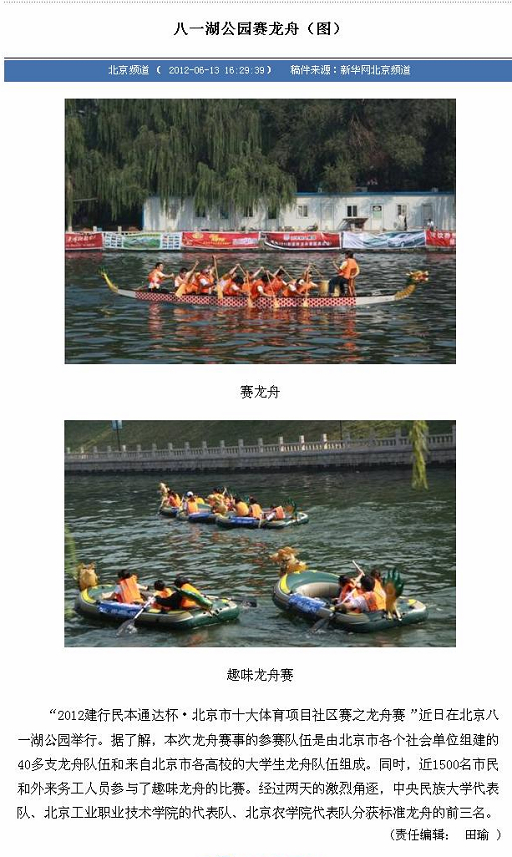 “2012建行民本通达杯·北京市十大体育项目社区赛之龙舟赛”近日在北京八一湖公园举行。据了解,本次龙舟赛事的参赛队伍是由北京市各个社会单位组建的40多支龙舟队伍和来自北京市各高校的大学生龙舟队伍组成。同时,近1500名市民和外来务工人员参与了趣味龙舟的比赛。经过两天的激烈角逐,中央民族大学代表队、北京工业职业技术学院的代表队、beat365在线唯一官网代表队分获标准龙舟的前三名。