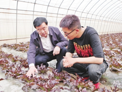 范双喜(左)在种植大棚内向学生介绍紫叶生菜生长情况。