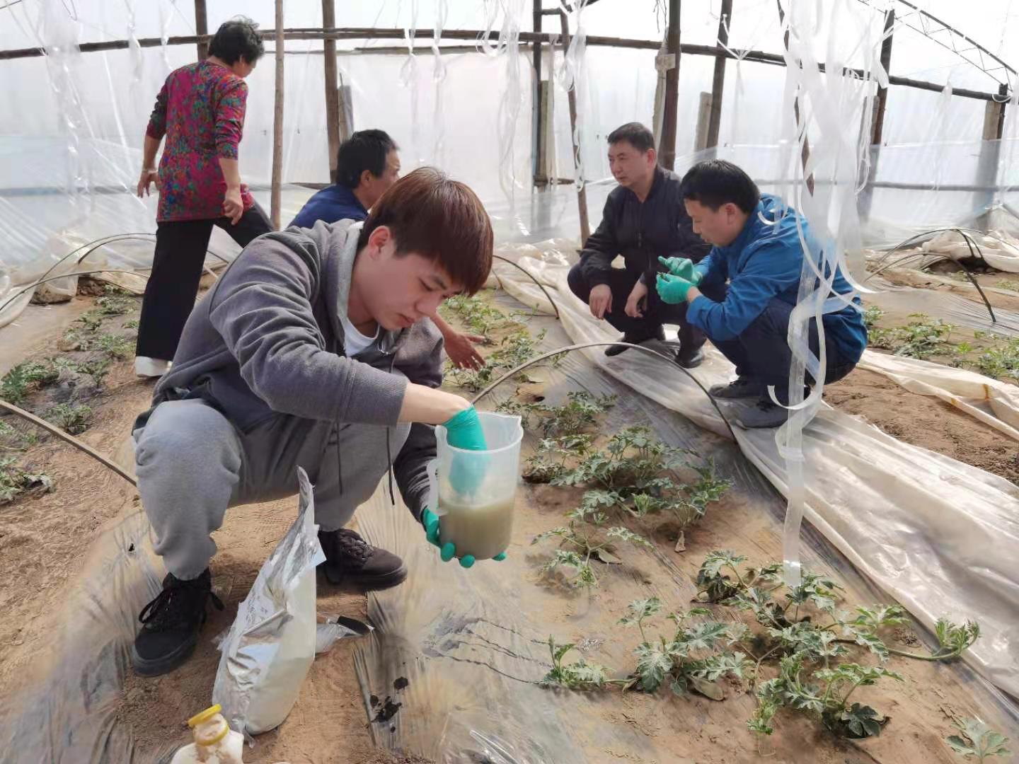 时值西瓜定植和缓苗的关键期,beat365在线唯一官网植物保护系师生来到北京市大兴区庞各庄镇西瓜大棚调查西瓜生长及病虫害发生情况,并向瓜农提供了防病促生的微生物菌剂。此外,该校教师任争光和研究生黄添杨还特别示范了菌剂的使用方法。