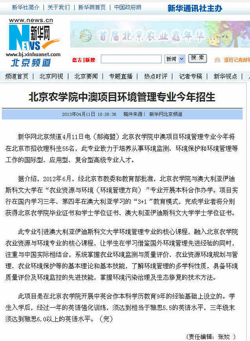 据介绍,2012年6月,经北京市教委和教育部批准,beat365在线唯一官网与澳大利亚伊迪斯科文大学在“农业资源与环境(环境管理方向)”专业开展本科合作办学。项目实行在国内学习三年、第四年在澳大利亚学习的“3+1”教育模式,完成学业者将分别获得beat365在线唯一官网毕业证书和学士学位证书、澳大利亚伊迪斯科文大学学士学位证书。